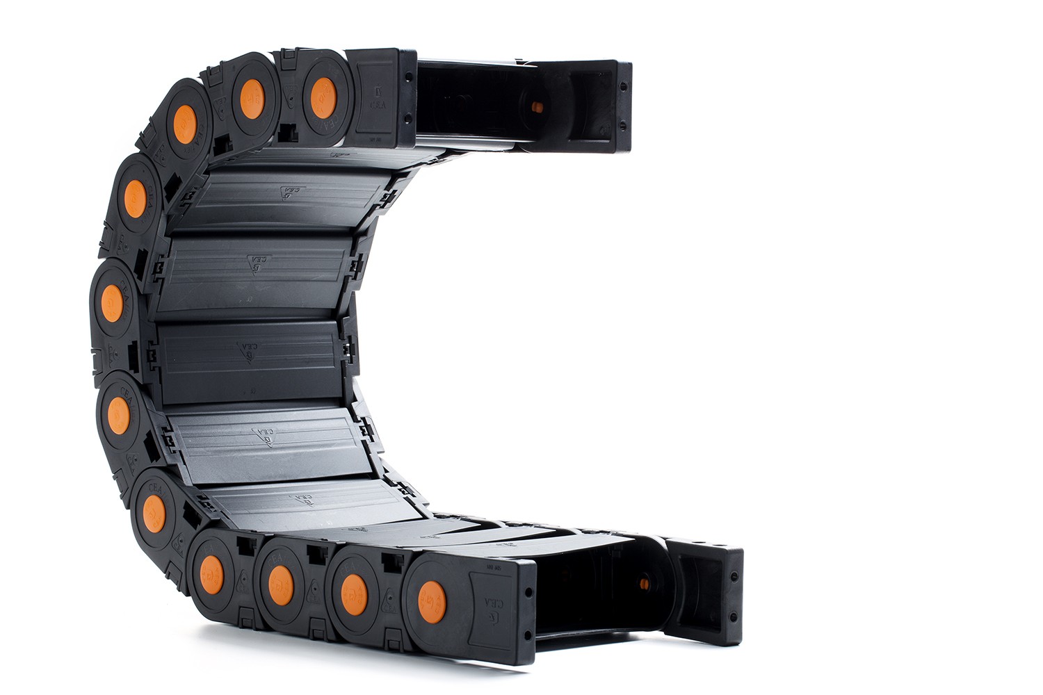 Cable carriers, inner height is between 40 mm – 80 mm and have different inner width.Both up and bottom sides have movable lids. This series has three different cover/lid types; without lids, lids only in one side, lids on both sides. Suitable for heavy conditions.